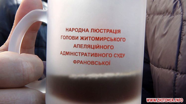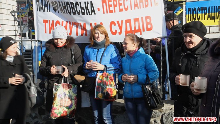 Плакати, шини, та сміттєві баки - працівники кондитерської фабрики «ЖЛ» зібралися під будівлею Житомирського апеляційного адміністративного суду, вимагаючи люстрації суддів. Вже о 7.30 біля будинку судді Катерини Франовської вишикувався пікет працівників, які підготували для неї заяву на звільнення. Працівники підприємства кажуть, що доводиться вдаватися навіть до таких методів, адже судова гілка влади потребує термінового очищення: