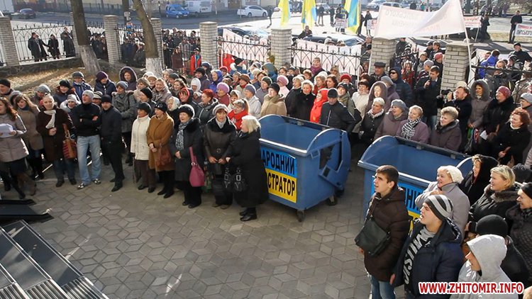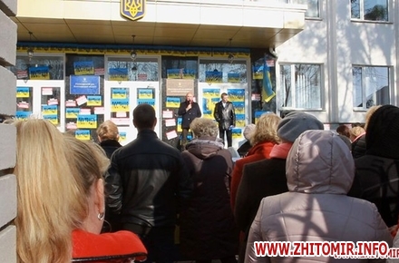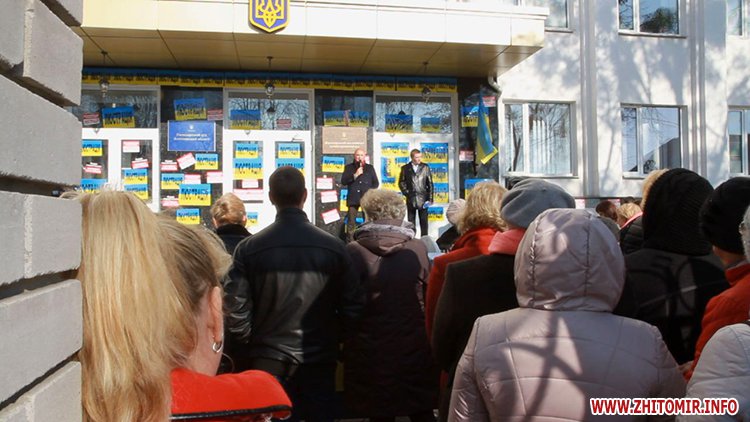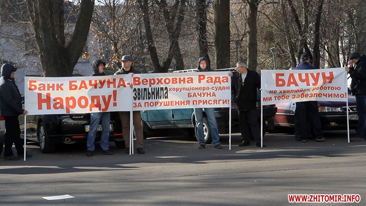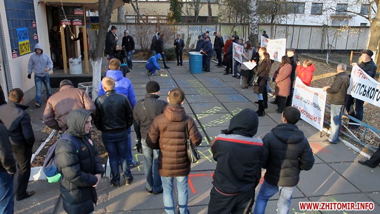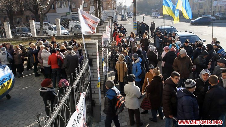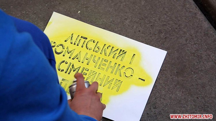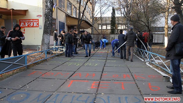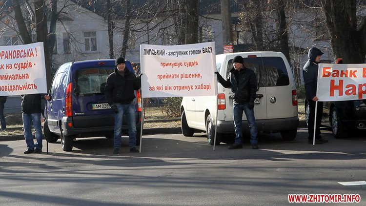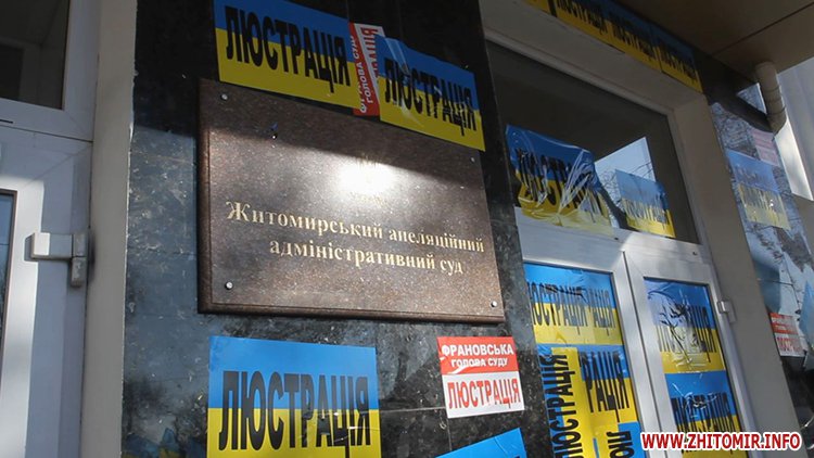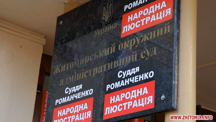 Далі пікетувальники рушили до Житомирського окружного адміністративного суду, де вимагали звільнення судді Романченка, який підпадає під закон про люстрацію.