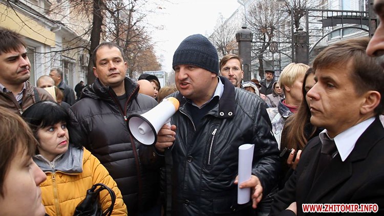 «До мене звернулися житомирські хлібні підприємства, які займаються виробництвом хлібобулочних виробів, і повідомили про те, що їм відомо, що мерія допускає на ринок хліба Житомира компанію, яка випускає свою продукцію під торговою маркою «Кулиничі». Якщо вам відомо, це торгова марка, котра належить і підконтрольна народному депутату Мисику від «Партії регіонів» в попередньому скликанні та Миколі Яновичу Азарову, представникам попередньої влади. Люди зібралися тут сьогодні для того що б сказати, що Житомир - це Україна. В Житомирі не може бути ніякого виробника від попередньої влади, тут не може бути ніяких сепаратистських настроїв. І випускати ці злочинці хліб в Житомирі не будуть, а також його продавати», - розповідає адвокат Євген Ткаченко.