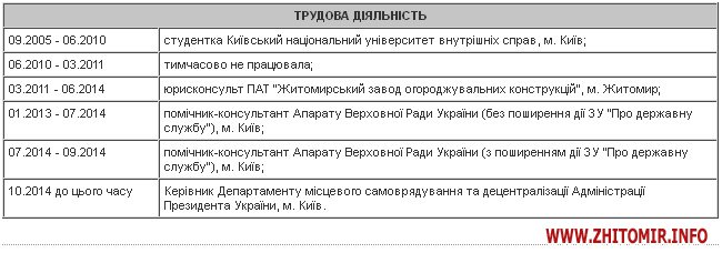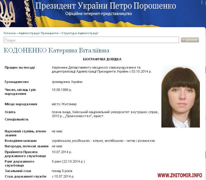 На официальном сайте президента есть биография Екатерины Кодоненко: родилась 18.08.1988 г. в Житомире, окончила Киевский национальный университет внутренних дел, с марта 2011 года работала юрисконсультом на Житомирском заводе ограждающих конструкций, с января 2013г. по сентябрь 2014г. – помощник-консультант народного депутата, с октября 2014г. – руководитель департамента в Администрации президента.