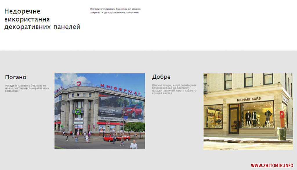 «Этот документ устанавливает «правила игры» для рекламных агентств, производителей информационных и других вывесок, средств визуальной рекламы, а также муниципальных органов, коммунальных предприятий и представителей бизнеса. Мы взяли за основу бренд-буки нескольких украинских городов (Ивано-Франковск) и столиц других стран мира. В частности, за основу брали те правила, которые подходят к общей архитектурной композиции Житомира», - объяснил первый заместитель мэра Житомира Сергей Сухомлин.