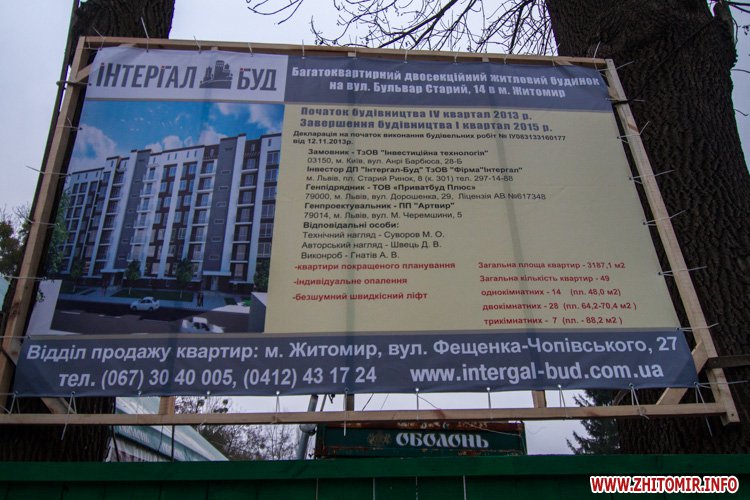 Як повідомляв Житомир.info, у грудні минулого року в парку почали будувати багатоповерхівку. Замовник будівництва на Старому бульварі, 14 – київська фірми «Інвестиційна технологія», інвестор – ДП «Інтергал-Буд» львівського ТОВ «Фірма «Інтергал ». Будівництво планували завершити у першому кварталі 2015 року.