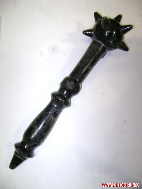 Или самая обычная булава: она может изготавливаться также в нескольких вариантах. Самый простой – с металлическими шипами. Значительно сложнее изготовить булаву с каменными шипами. И сложность-то не в болванке, а в самих шипах, потому как это мелкая деталь, изготовление которой – тонкая работа. Поэтому не удивительно, что из 80 заготовок шипов до финиша доходит 15-20 (необходимое количество), остальное – брак.