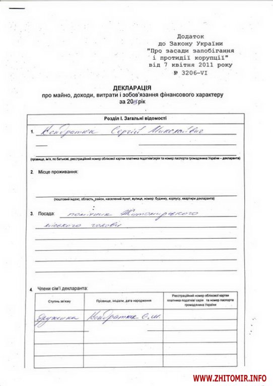 «20 ноября 2014 в Житомирском городском совете начато проведение проверки, предусмотренной Законом Украины «Об очистке власти» претендента на должность помощника Житомирского городского головы – Кондратюка Сергея Николаевича. Копии заявления о проведении проверки и декларации об имуществе, доходах, расходах и обязательствах финансового характера за 2013 Кондратюка С.Н. прилагаются», - говорится в сообщении на сайте.