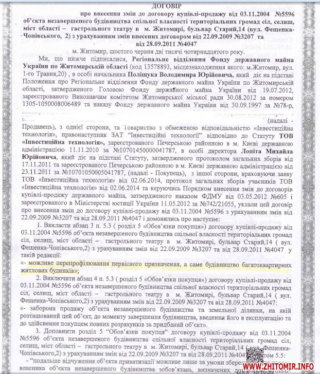 Також зазначається, що у договорі купівлі-продажу об’єкту незавершеного будівництва (а саме - гастрольного театру) внесені зміни, які дозволяють перепрофілювати первісне призначення об’єкта.
