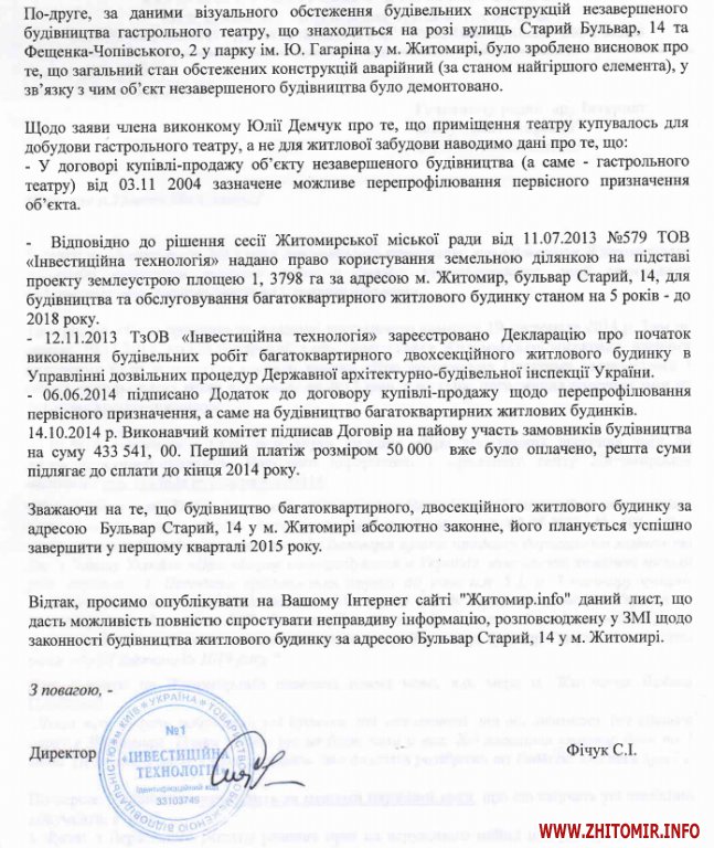 Про це йдеться у листі на адресу редакції Житомир.info за підписом директора ТОВ «Інвестиційна технологія» Фічук С.І.