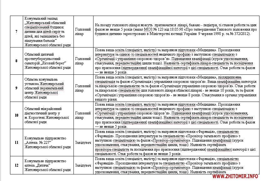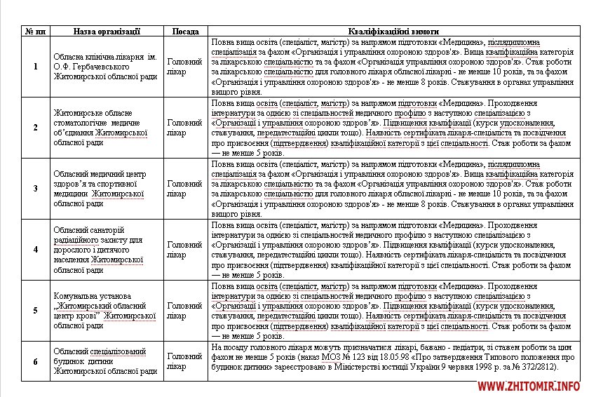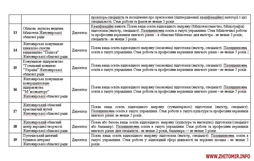 «У вівторок газета «Житомирщина» і сайт обласної ради, як того вимагає закон, опублікує усі 19 оголошень про проведення конкурсів на заміщення вакантних посад. Після цього для бажаючих взяти участь у конкурсах буде надано 30 днів, щоб подати свої документи. Новацією є те, що від кандидатів вимагається представити бізнес-план чи план розвитку того чи іншого комунального підприємства чи установи. Після цього відповідна конкурсна комісія відбере кандидатів, які підпадають під кваліфікаційні вимоги, і заслухає їх презентації щодо розвитку підприємства чи установи», - розповів Руслан Годований.
