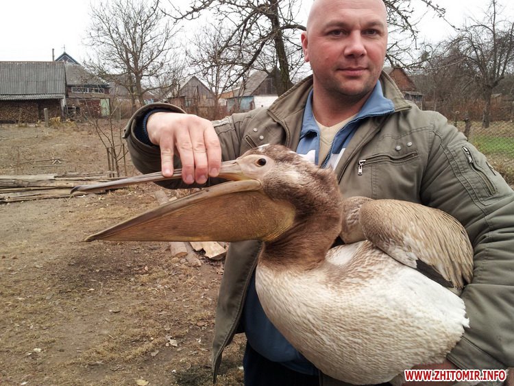 Пеліканів поблизу річки Уборть виявив директор Олевської гімназії Євгеній Рябой. Чоловік хвилювався, що екзотичні плахи замерзнуть, а тому відловив їх та привіз додому. Згодом птахів перевезли на тимчасове утримання до місцевого лісництва.