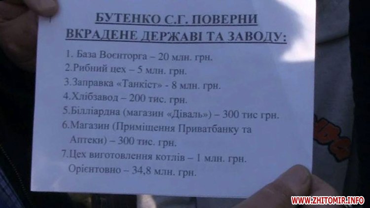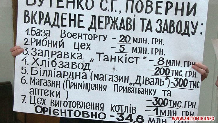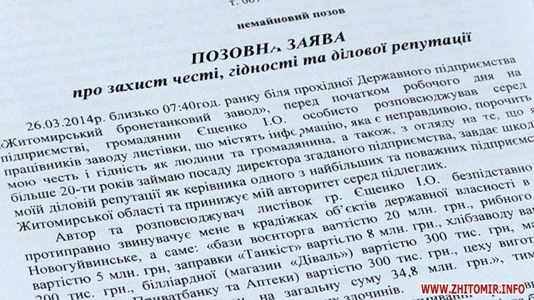 Захищати честь і гідність у Житомирському районному суді вирішив директор бронетанкового заводу Сергій Бутенко. Сплатити 10 тисяч гривень моральної шкоди він вимагав у активіста Івана Єщенка, який ще у березні перед акцією протесту роздавав працівникам заводу листівки.