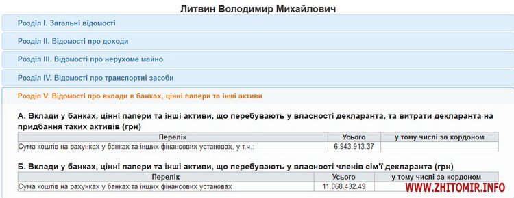 На счетах в банковских учреждениях у Литвина 6 млн. 943 тыс. 913 грн., у его жены – 11 млн. 68 тыс. 432 грн.