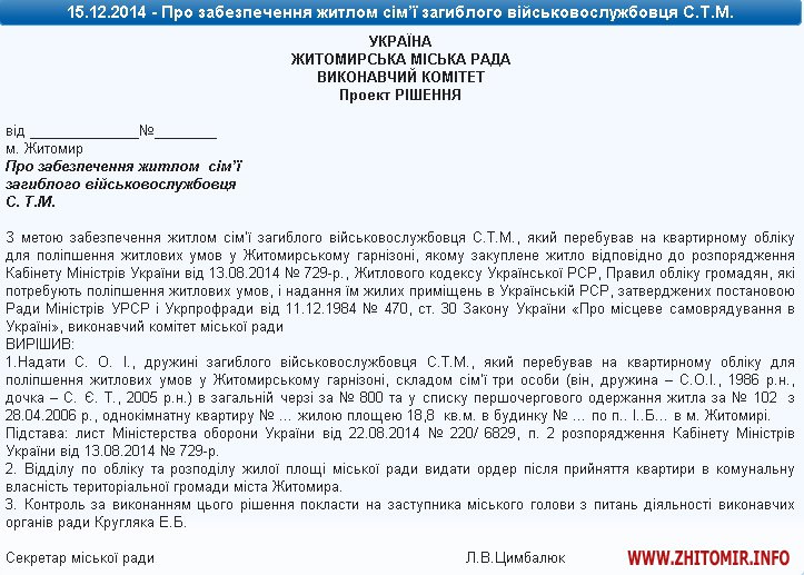 Проект рішення виконавчого комітету Житомирської міської ради «Про забезпечення житлом сім’ї загиблого військовослужбовця С. Т.М.» опублікований на офіційному сайті мерії.