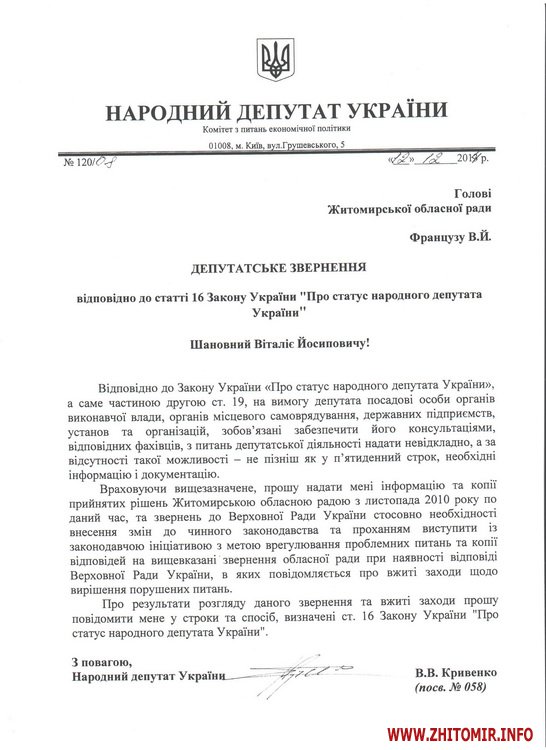 Також Кривенко додає, що представники Житомирщини у Верховній Раді планують провести зустріч із керівництвом області – головою ОДА Сергієм Машковським та головою обласної ради Віталієм Французом. На цій зустрічі вони окреслять ряд першочергових проблем, які стоять перед областю і які можна вирішити у Верховній Раді.