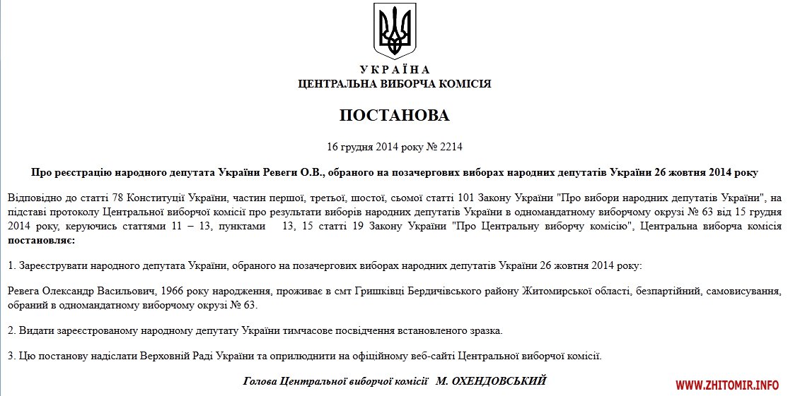 Постановление № 2214 о регистрации народного депутата Украины Ревега А.В., избранного на внеочередных выборах народных депутатов Украины 26 октября 2014, опубликовано на сайте Центральной избирательной комиссии 16 декабря.