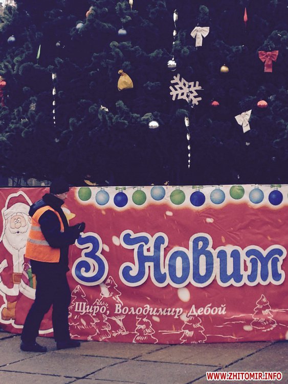 На главной елке Житомира, которую установили на площади Королева, повесили поздравление от бывшего мэра Владимира Дебоя.