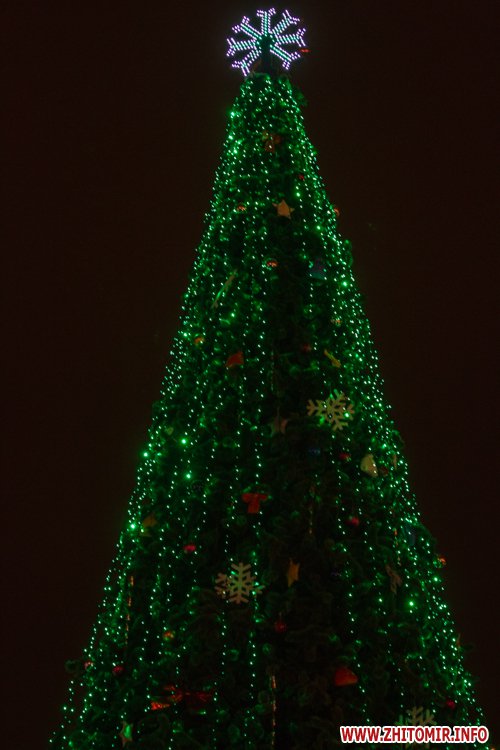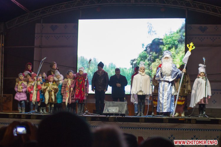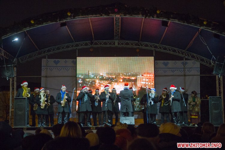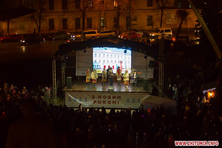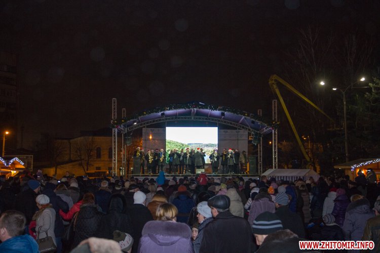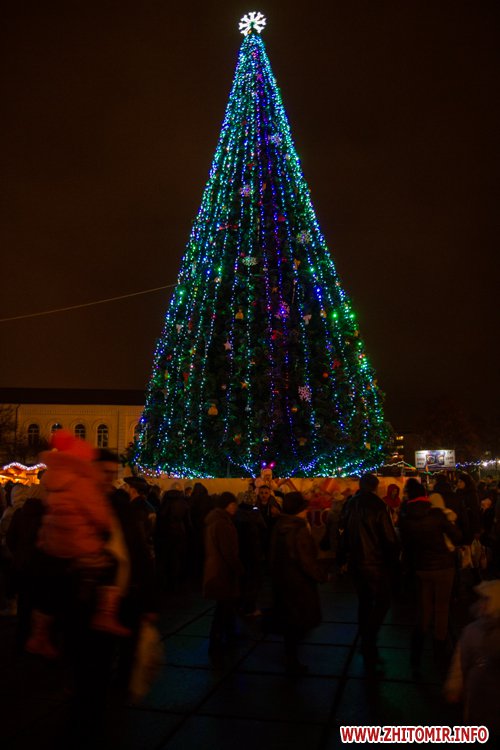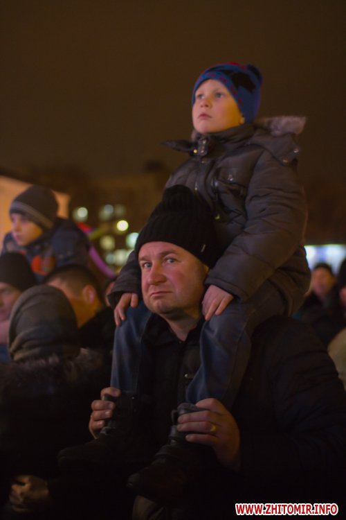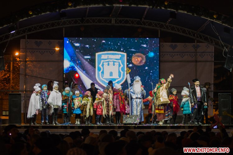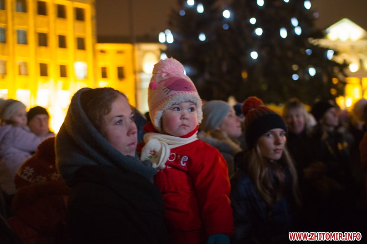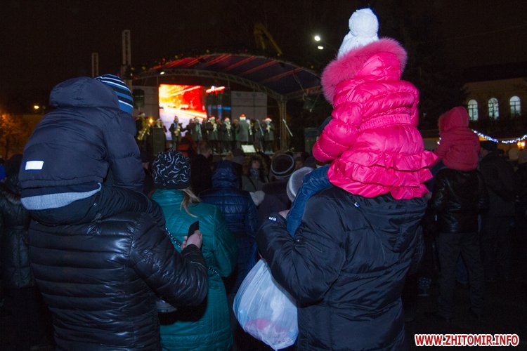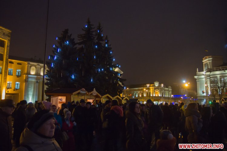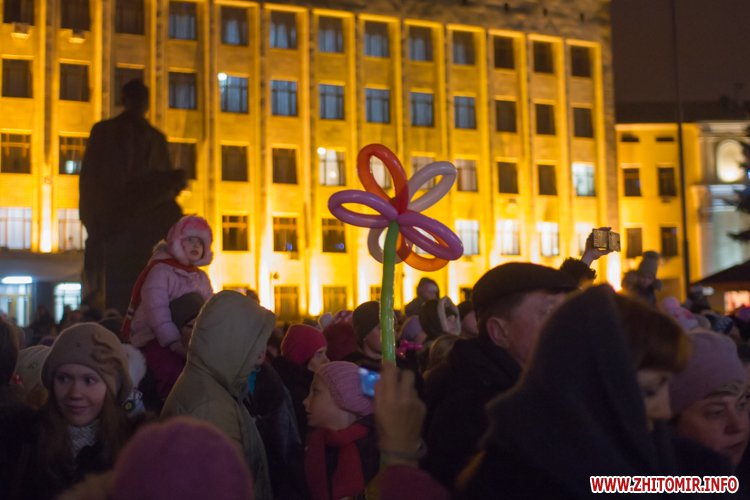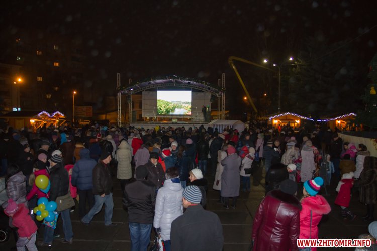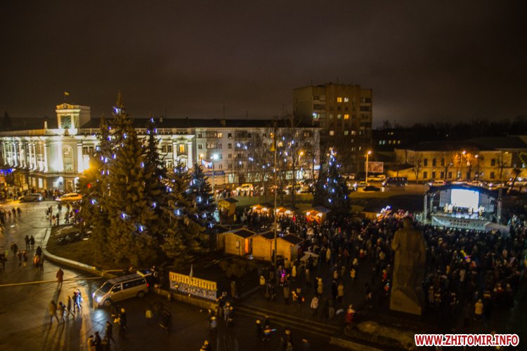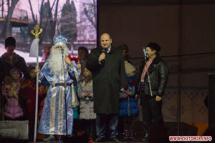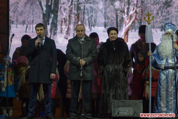 Після невеличкої концертної програми, з наступаючими новорічними святами жителів міста привітали представники міської та обласної влади: в.о. мера Любов Цимбалюк, голова облради Віталій Француз та губернатор Сергій Машковський. З вітальним словом до житомирян також звернувся народний депутат Борислав Розенблат.