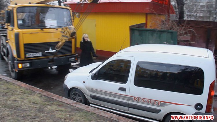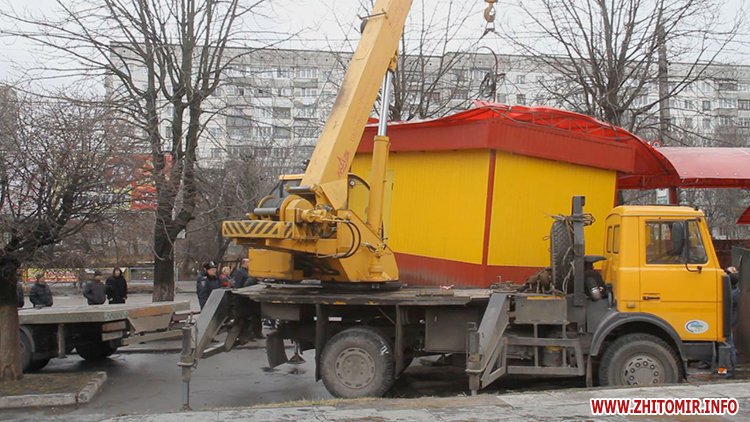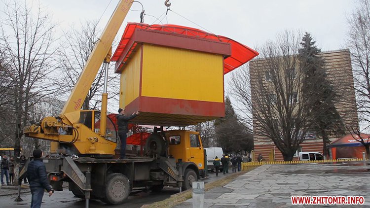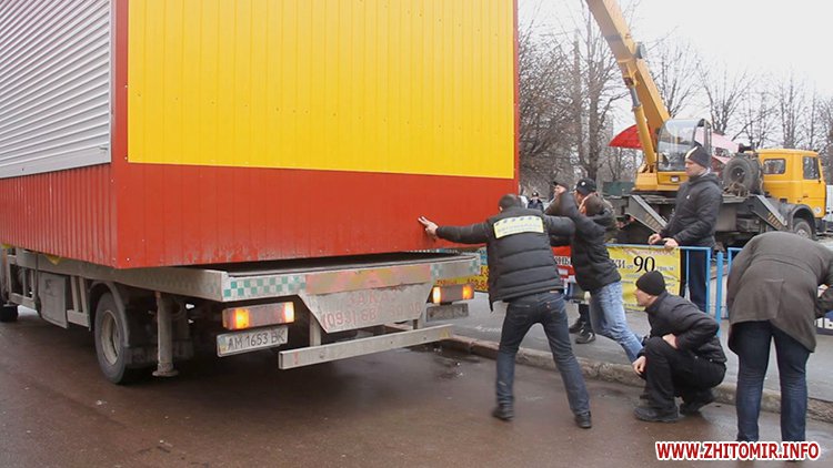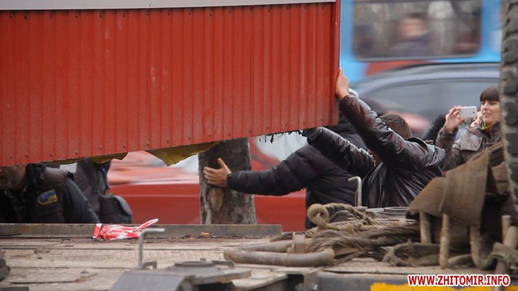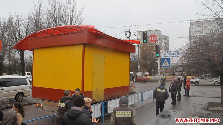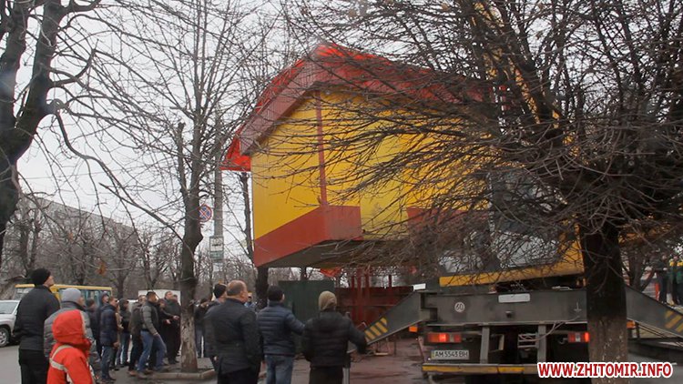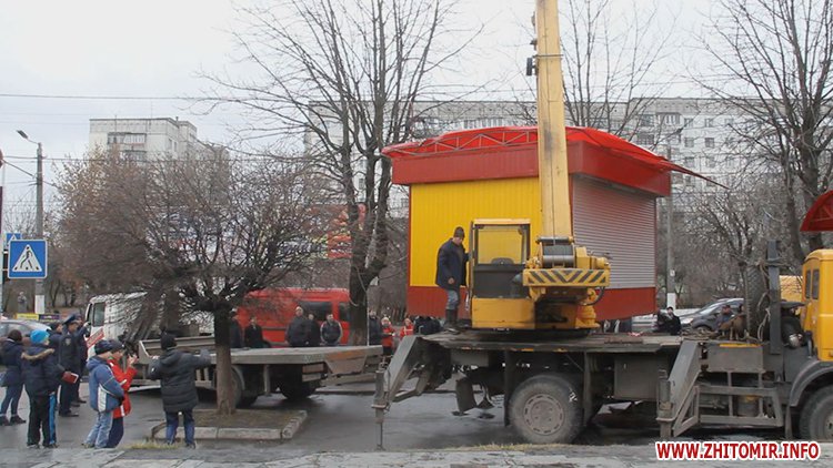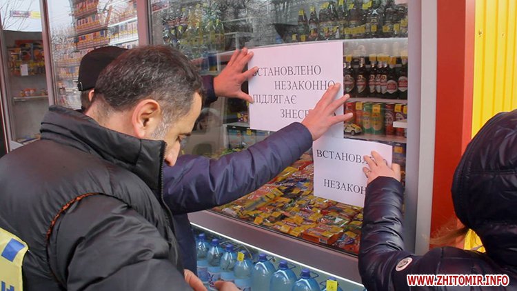 Вранці 24 грудня кілька десятків активістів та представники КП «Інспекція з благоустрою м. Житомира» зібрались на вулиці Вітрука, аби демонтувати кіоск біля супермаркету «Фуршет». Активісти кажуть: у власника малої архітектурної форми не було жодних дозвільних документів на встановлення кіоску, тому МАФ встановлено незаконно.