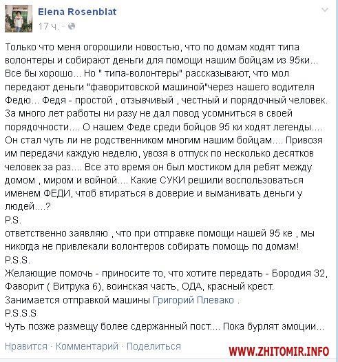 Сестра народного депутата от Житомира Елена Розенблат сообщает, что в областном центре появились псевдо-волонтеры.