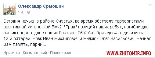 «Сегодня ночью, в районе Счастья, во время обстрела террористами реактивной установкой БМ-21 «Град» позиций наших ребят, погибли два наших пацана, двое наших братьев, 26-й артбригады 4-го дивизиона 12-й батареи: Вовк Иван Михайлович и Яндзюк Олег Васильевич. Вечная Вам память, парни...», - написал на своей странице в соцсети Александр Ермошин.