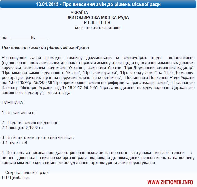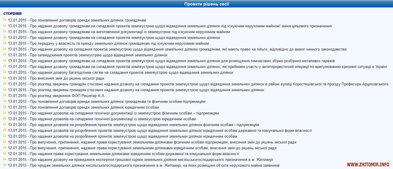 На сайте Житомирского городского совета за 12 и 13 января опубликовали 25 проектов решений сессии по земельным вопросам.