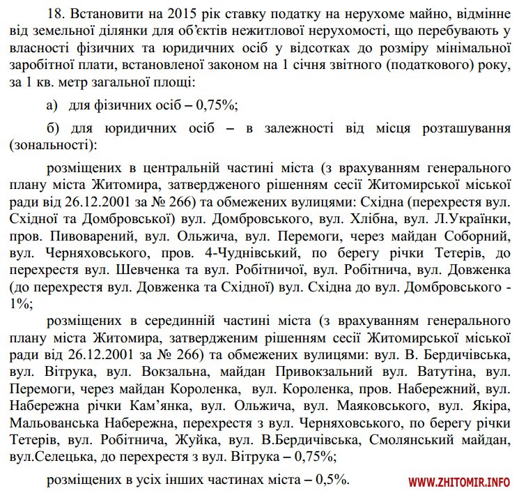 У Житомирі хочуть встановлювати розмір податку на нежитлову нерухомість юридичних осіб у залежності від розташування об’єкту.