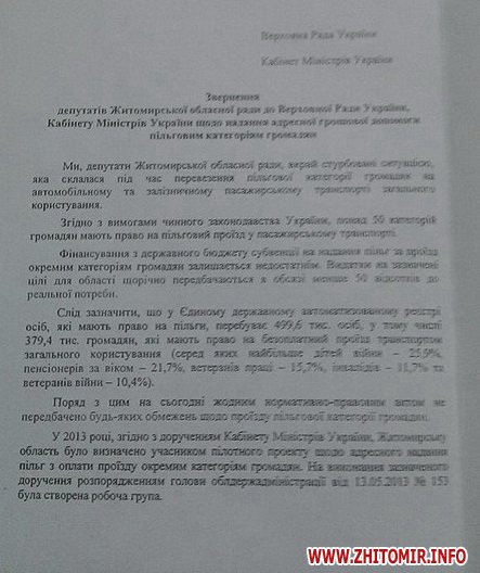 Зокрема, у зверненні йдеться про стурбованість депутатами зменшенням нормативу зарахування до обласних бюджетів рентної плати за користування надрами для видобування корисних копалин загальнодержавного значення з 50 відсотків до 25 відсотків, у результаті чого бюджет Житомирської області у 2015 році втратить близько 22 млн. грн., та зменшенням податку на доходи фізичних осіб до місцевих бюджетів до 75 відсотків (раніше 100%), внаслідок чого втрати бюджету складуть близько 350 млн. грн.