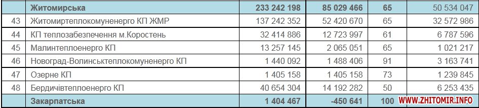 Сумарний борг підприємств Житомирської область перед «Нафтогаз України» за газ, спожитий для виробництва теплової енергії, становить 233 млн. 242 тис. 198 грн., з яких 85 млн. 29 тис. 466 грн. область заборгувала у 2014 році. Рівень оплати підприємств теплоенергетики минулого року в середньому по області становив 65%. Більше половини заборгованої суми на рахунку КП «Житомиртеплокомуненерго».