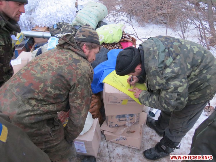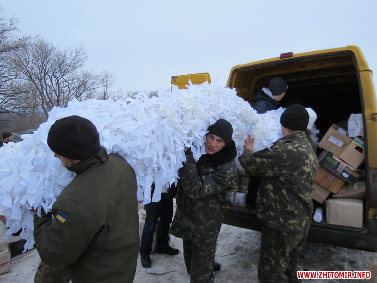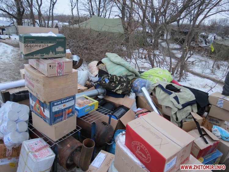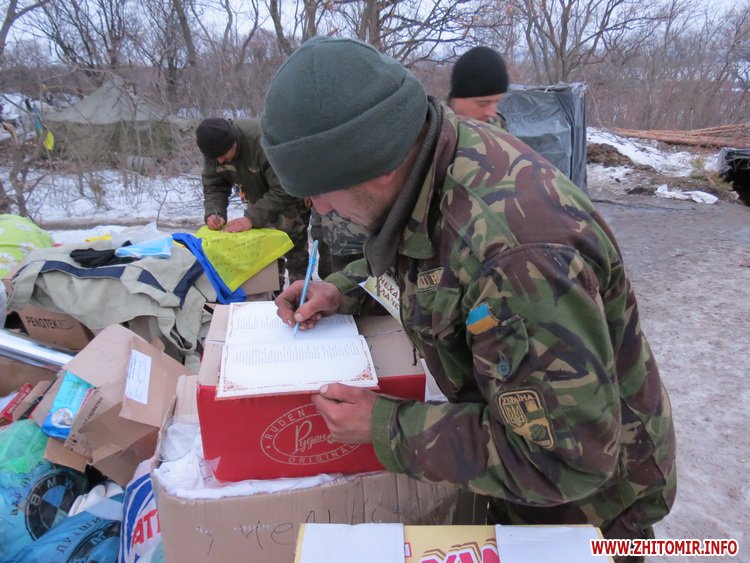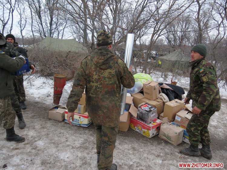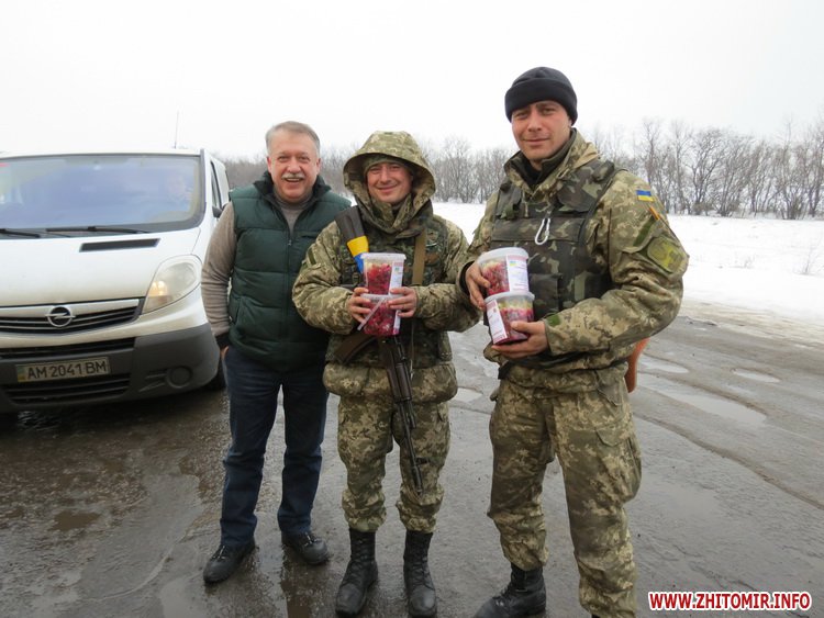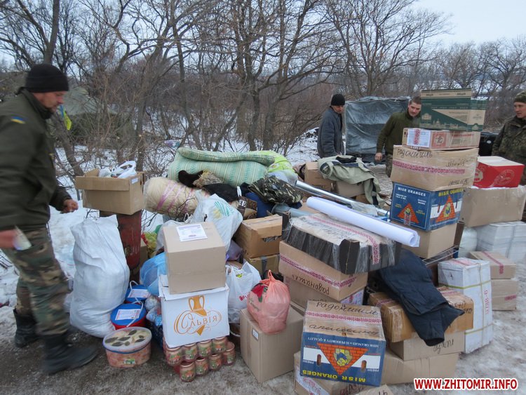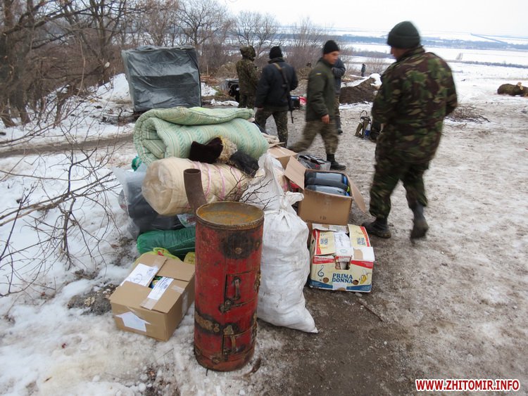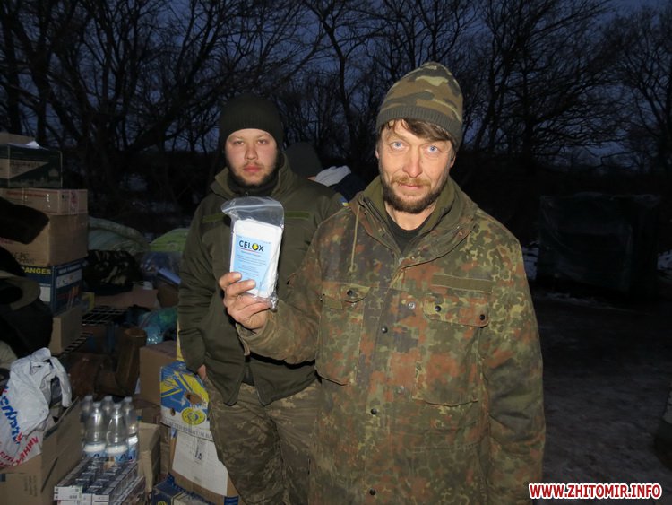 Вообще в этот раз мы завезли много еды, воду, чай, кофе, сигареты, теплые вещи, спальники, одеяла, маскировочные сети, буржуйки, балаклавы, перчатки, шапки, стельки, терьмостельки, теплые носки, в частности и вязанные – сотрудницы Дома малютки распускают старые детские вещи, вяжут варежки и носки. Новоград-волынские пасечники, которые торговали на рождественской ярмарке в «Глобале», передали ребятам медовую настойку. Отвезли бойцам и шесть пакетов кровоостанавливающего средства «Целокс», который передали из Англии. Отдали его на самый-самый перед пацанам.