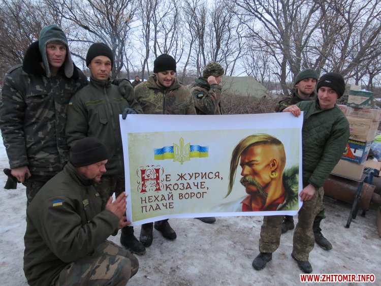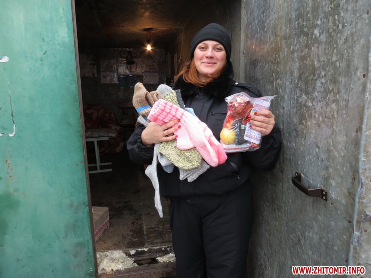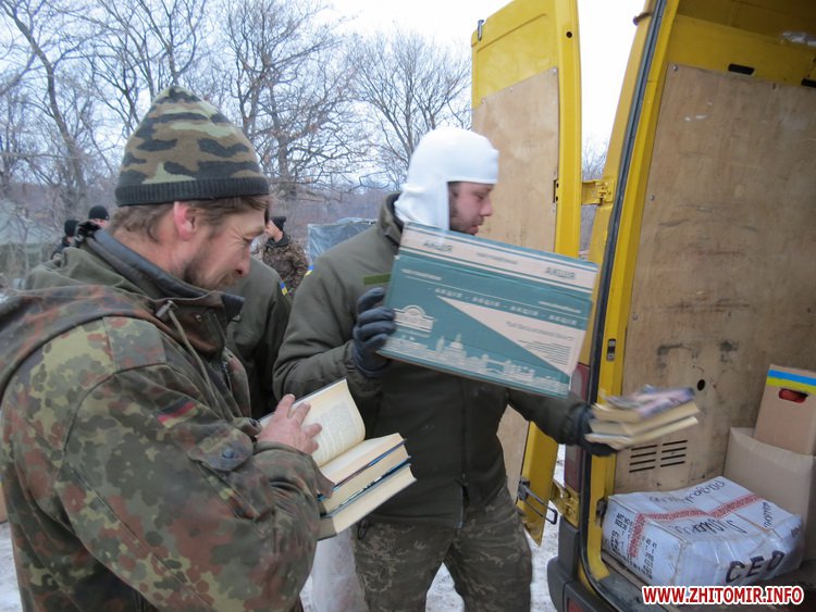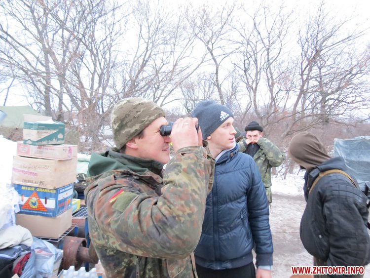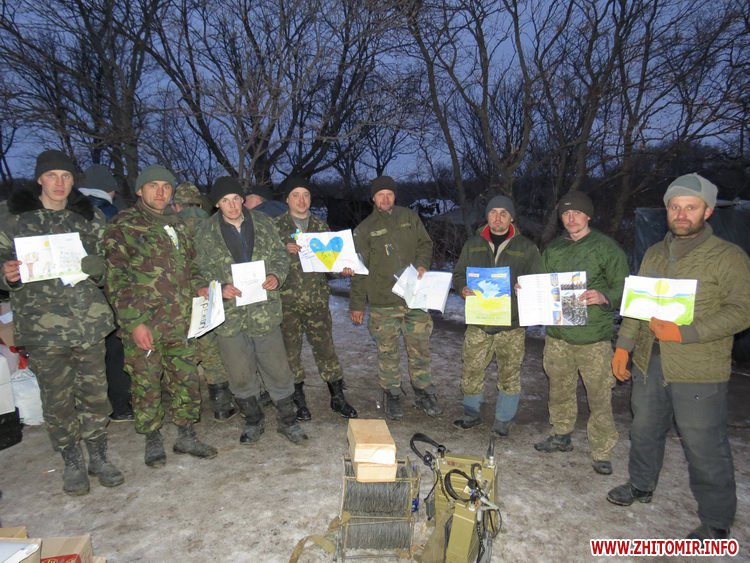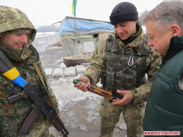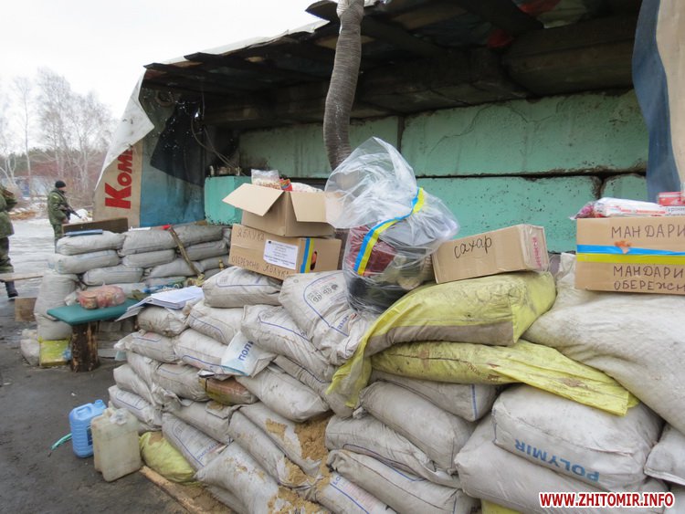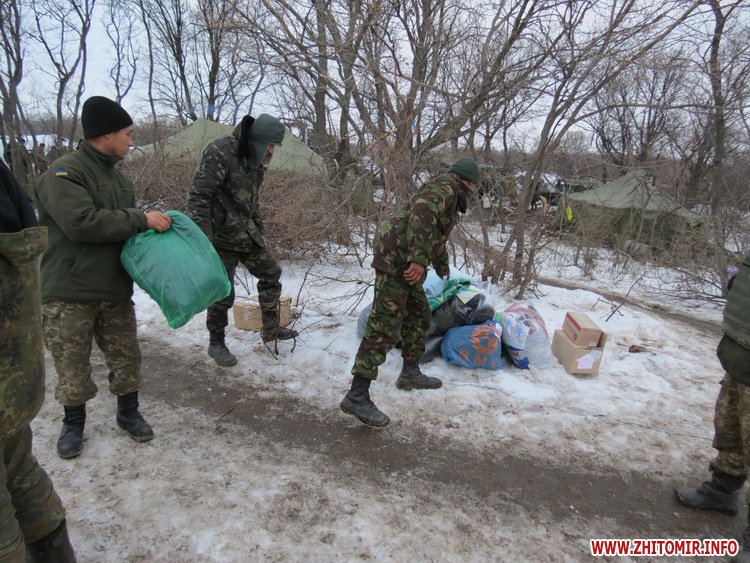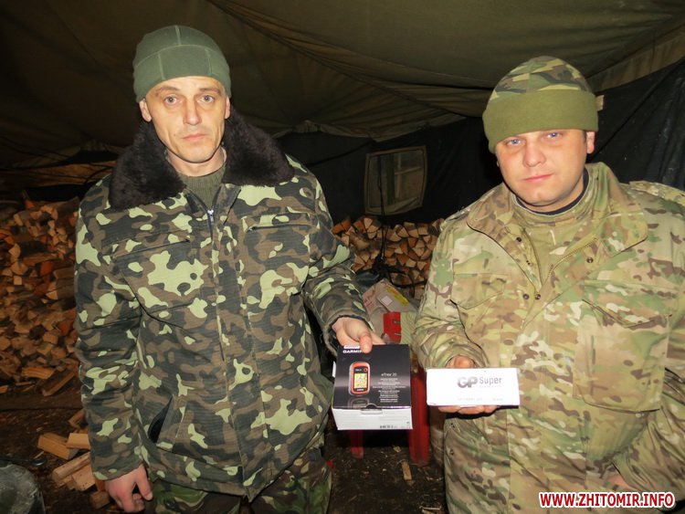 Вообще в этот раз мы завезли много еды, воду, чай, кофе, сигареты, теплые вещи, спальники, одеяла, маскировочные сети, буржуйки, балаклавы, перчатки, шапки, стельки, терьмостельки, теплые носки, в частности и вязанные – сотрудницы Дома малютки распускают старые детские вещи, вяжут варежки и носки. Новоград-волынские пасечники, которые торговали на рождественской ярмарке в «Глобале», передали ребятам медовую настойку. Отвезли бойцам и шесть пакетов кровоостанавливающего средства «Целокс», который передали из Англии. Отдали его на самый-самый перед пацанам.