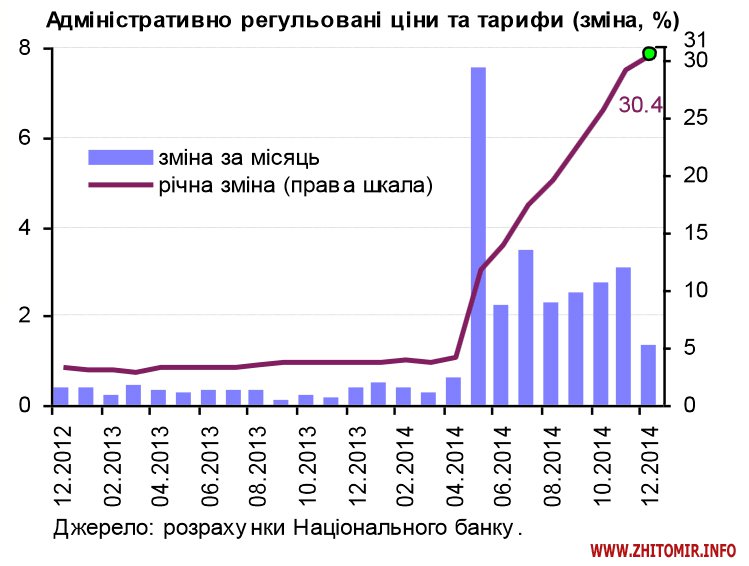Вагомий внесок в інфляцію (6.6 в.п.) обумовила її адміністративна складова. Зростання адміністративно регульованих цін, яке до квітня поточного року відбувалося стриманими темпами (близько 4% у річному вимірі), стрімко прискорилося до 30.4% у 2014 році.
