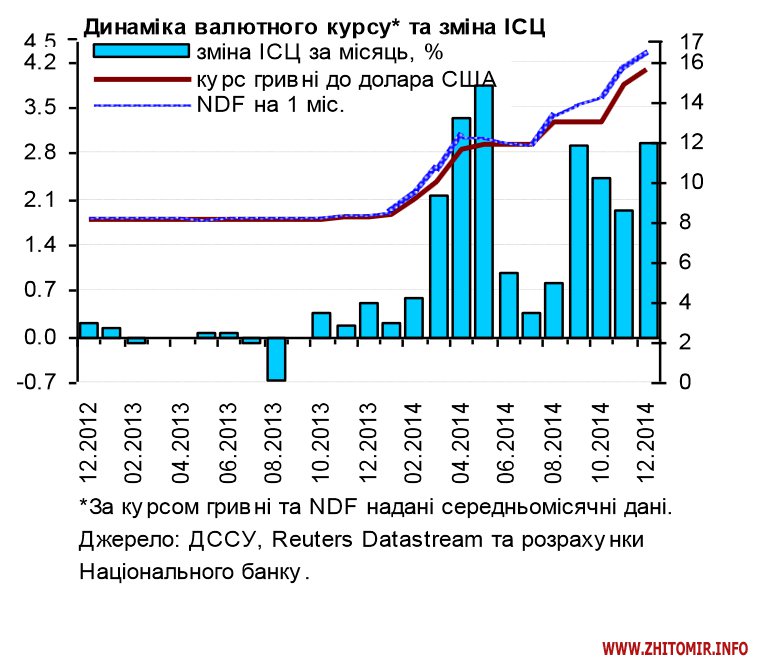 «Реалізація накопичених в останні роки макроекономічних дисбалансів призвела до стрімкого зростання інфляції в 2014 році до 24.9%, що обумовлювалося: девальвацією гривні в умовах зниження валютних надходжень та наростання панічних настроїв через військовий конфлікт на сході України; вагомою адміністративною складовою (6.6 в.п.) інфляції через старт процесу приведення тарифів у сфері житлово-комунального господарства до рівня покриття їх собівартості», - пояснюють в НБУ.