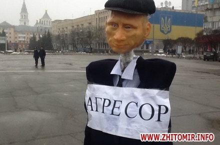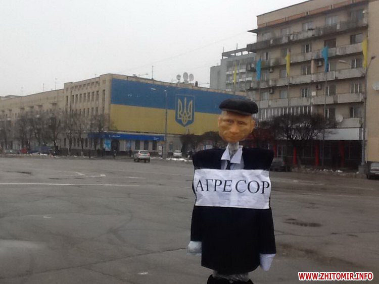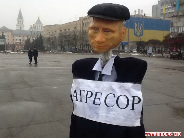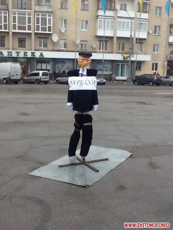 Во время акции сожгли чучело Путина, на груди которого висела табличка «Агрессор».