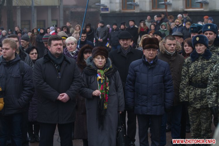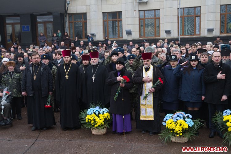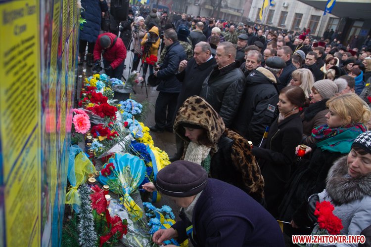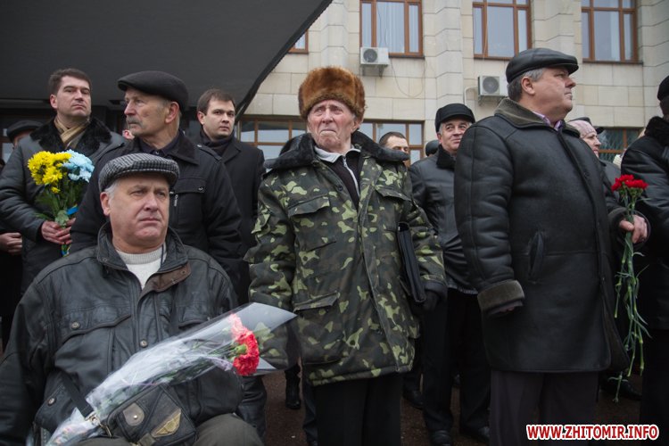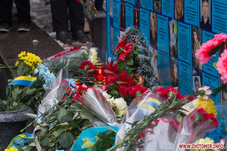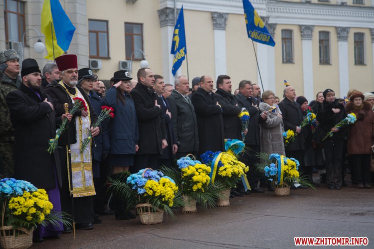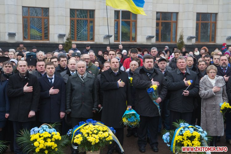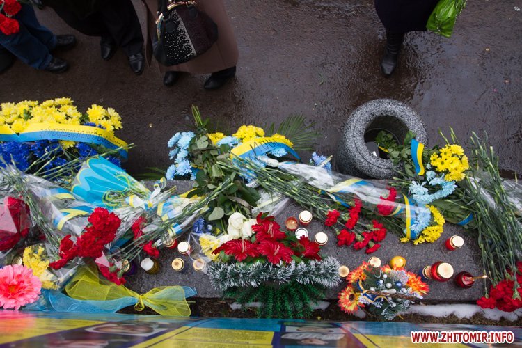 На майдані Корольова присутні поклали квіти до меморіалу Небесної сотні, а також вшанували загиблих хвилиною мовчання.