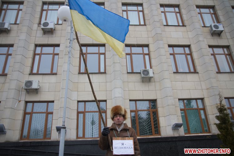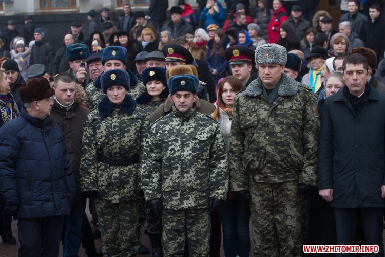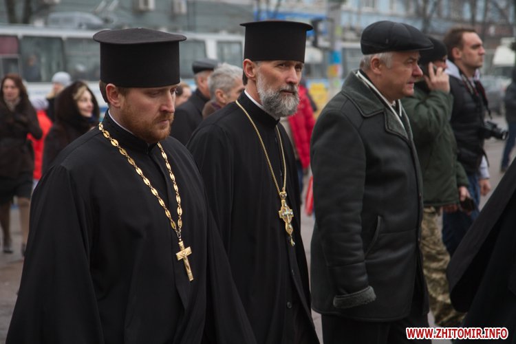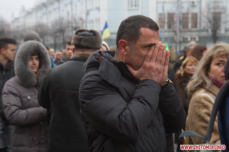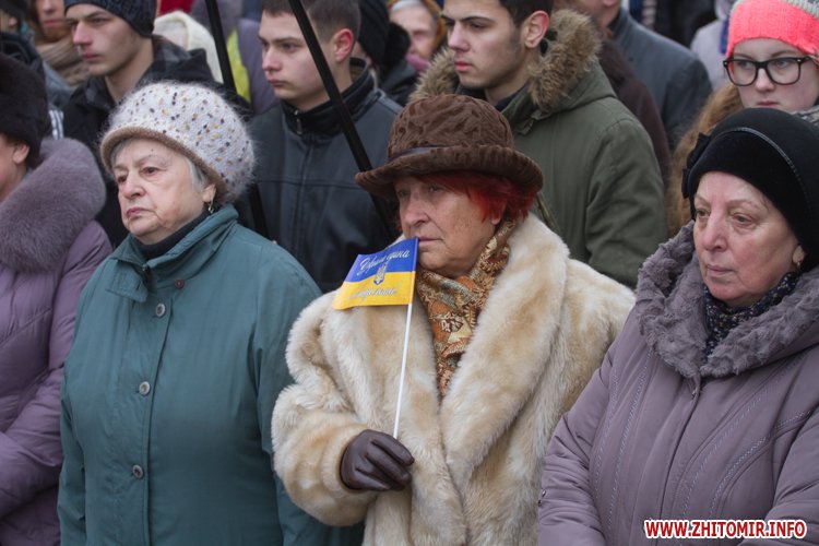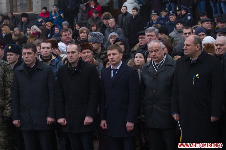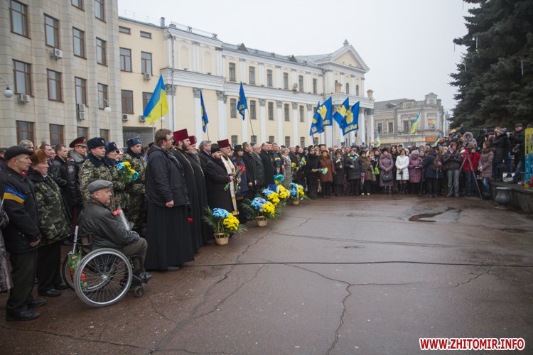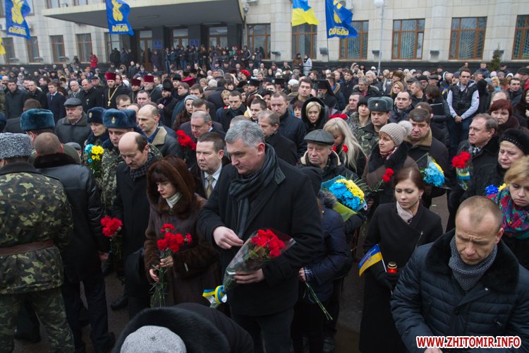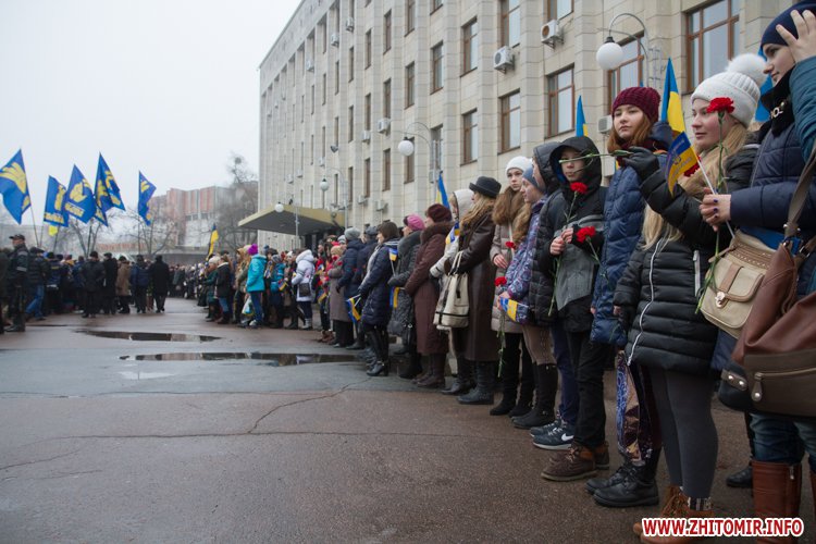 На майдані Корольова присутні поклали квіти до меморіалу Небесної сотні, а також вшанували загиблих хвилиною мовчання.
