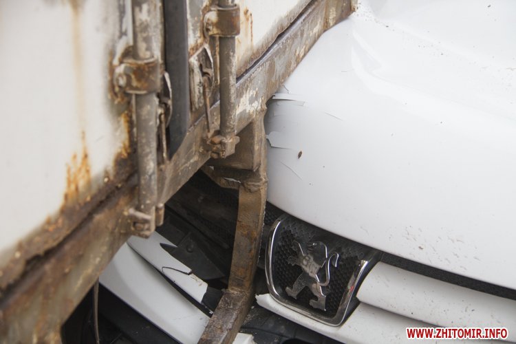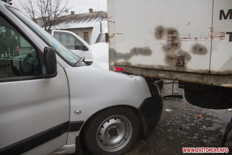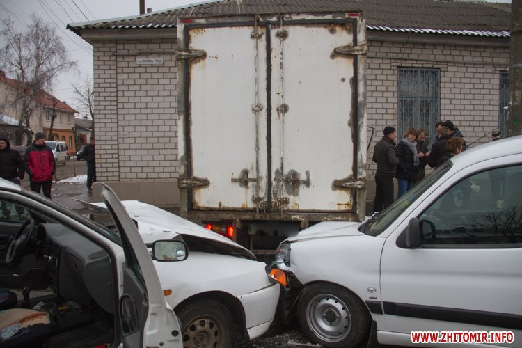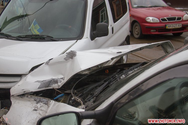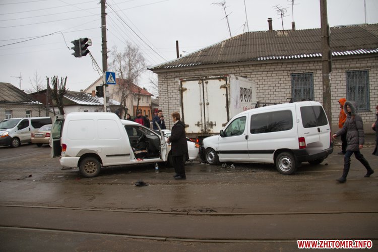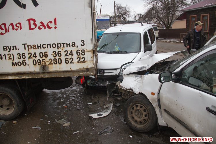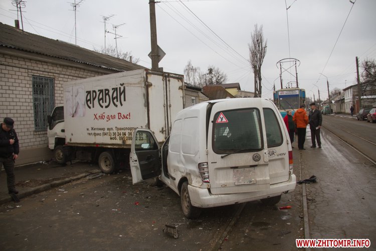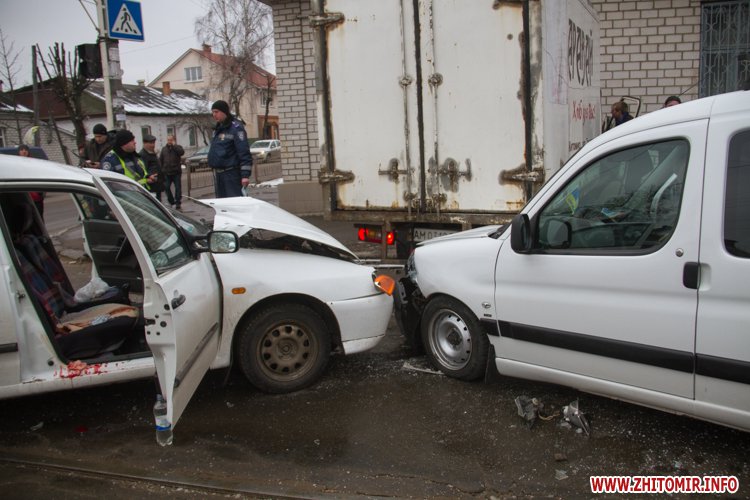 Авария произошла около 13.00 на перекрестке улиц Мануильского-Бориса Тена. По словам очевидцев, автомобиль Volkswagen Caddy поворачивал на Бориса Тена и столкнулся с грузовиком житомирского хлебозавода, в который потом въехал Peugeot Partner.