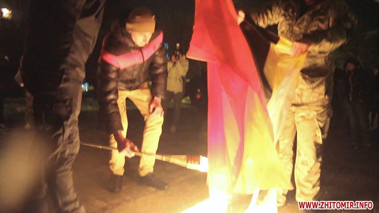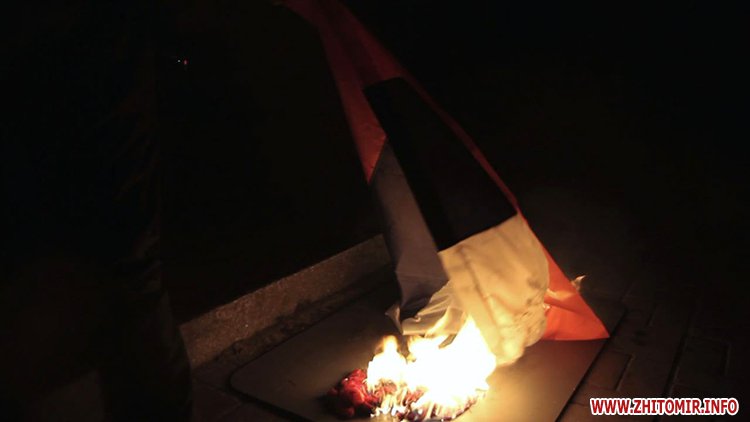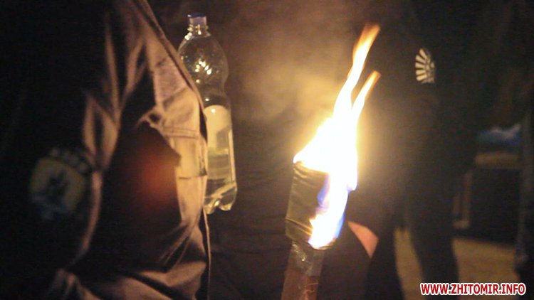 Близько 200 людей з прапорами та смолоскипами пройшли від майдану Соборного до пам’ятника Тарасу Шевченку на вулиці Великій Бердичівській. Біля пам’ятника відбувся мітинг, під час якого спалили червоний прапор колишнього СРСР та триколор Російської Федерації.