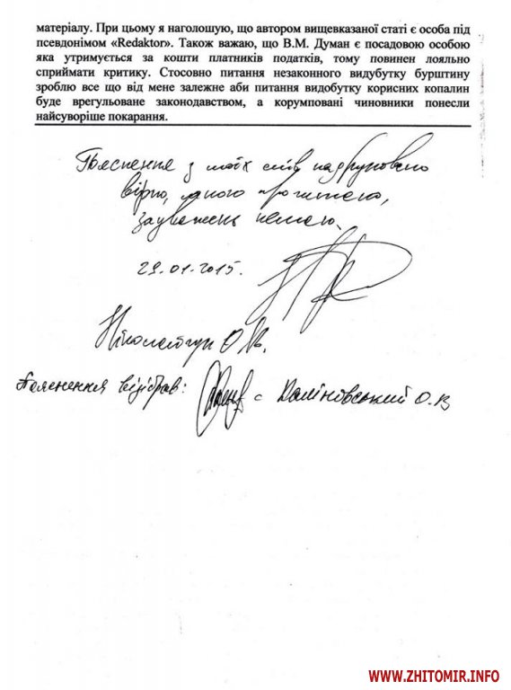 «Сегодня меня вызвали в прокуратуру по жалобе начальника Олевского райотдела милиции Думана В.Н. Оказывается, что милиционер видит в моих действиях признаки клеветы и унижения чести, достоинства и деловой репутации. Он требует, чтобы прокуратура провела расследование и привлекла меня к ответственности. Все потому, что на страницах Олевского информационного появился материал, который указывает о прямом сотрудничестве руководства Олевского РО милиции и Житомирского областного управления к так называемой «янтарной мафии». Конечно, показания по данному вопросу я предоставил, а также объяснил, что намерен сделать все возможное, чтобы легализовать добычу янтаря и привлечь к ответственности коррумпированных чиновников», - написал 29 января в фейсбук Александр Николайчук.