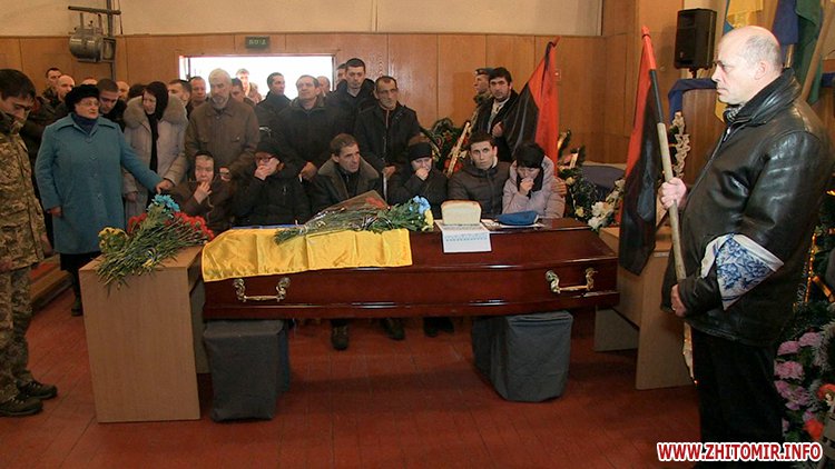 Попрощатися з героєм прийшли кілька сотень житомирян. Проводжали військовослужбовця в останню путь стоячи навколішки і вигукуючи «Герої не вмирають!».