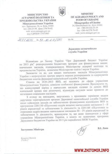 «Відповідно до Закону України «Про Державний бюджет України на 2015 рік» фінансування усіх вищих навчальних закладів має здійснюватися через Міністерство освіти і науки України. Проте на сьогоднішній день всі аграрні навчальні заклади України залишаються юридично підпорядкованими Міністерству аграрної політики та продовольства України. Внаслідок такої ситуації Державне казначейство України не може здійснювати перерахування бюджетних коштів аграрним вищим навчальним закладам. Як результат – відсутність стипендій, заробітних плат та неможливість оплати університетом рахунків за комунальні послуги. У такій же ситуації сьогодні перебувають усі аграрні університети, коледжі та технікуми. За інформацією Мінагрополітики України 28 січня 2015 року Кабінет Міністрів України має розглянути питання передачі аграрних вишів до Міністерства освіти і науки України. Після цього одразу буде вирішено питання усіх виплат.», - йдеться у звернені керівника університету, опублікованому 28 січня ц.р.