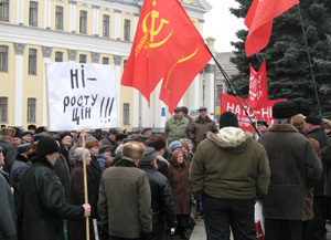 Сторонники Компартии Украины провели сегодня митинг протеста на центральной площади Житомира Королева около здания госадминистрации. В митинге приняло участие около 100 человек.