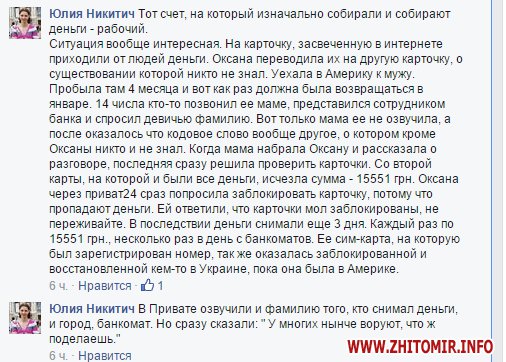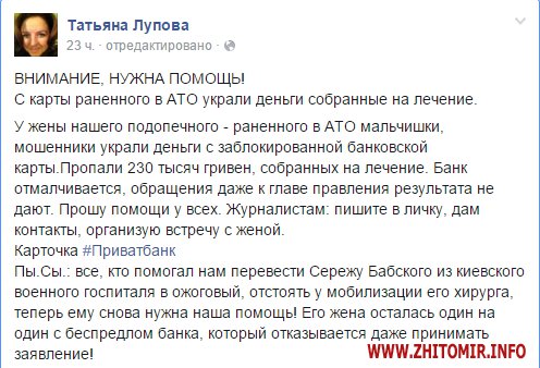 «С карты раненного в АТО жителя Житомирской области Сергея Бабского украли деньги собранные на лечение. У жены нашего подопечного - раненного в АТО мальчишки, мошенники украли деньги с заблокированной банковской карты Приватбанка. Пропали 230 тысяч гривен, собранных на лечение. Банк отмалчивается, обращения даже к главе правления результата не дают. Прошу помощи у всех», - сообщила волонтер.