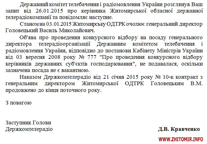 «По состоянию на 03.01.2015 Житомирскую ОГТРК возглавляет генеральный директор Головецкий Василий Николаевич. Объявление о проведении конкурсного отбора на должность генерального директора телерадиоорганизации Государственным комитетом телевидения и радиовещания Украины не подавалось, поскольку указанная должность не является вакантной. Приказом Госкомтелерадио от 21 января 2015 года № 10-к контракт с генеральным директором Житомирской ОГТРК Головецким В.Н. продлен до конца текущего года», - сообщает Государственный комитет телевидения и радиовещания.