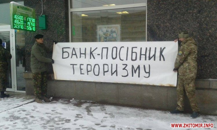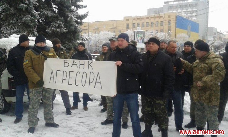 5 лютого у Житомирі кілька десятків активістів пікетують відділення російського банку на майдані Соборному.