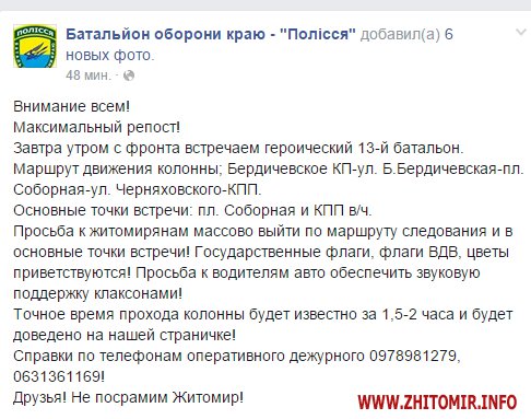 «Завтра утром с фронта встречаем героический 13-й батальон. Маршрут движения колонны: Бердичевское КП - ул. Б.Бердичевская - пл. Соборная - ул. Черняховского - КПП. Основные точки встречи: пл. Соборная и КПП в/ч», - сообщают в батальоне «Полесье» и просят житомирян массово выйти по маршруту следования и в основные точки встречи десантников.
