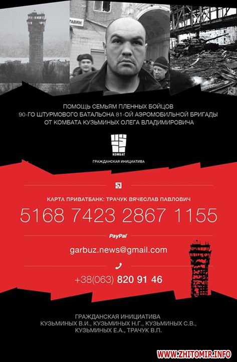 Как сообщал Житомир.info, 20 января подполковник Олег Кузьминых, командир штурмового батальона 81-й десантной бригады попал в плен. Это произошло утром, когда подразделение во главе с командиром двигался в сторону Донецкого аэропорта, чтобы спасти раненых бойцов. Родные пленного офицера обращались к президенту и всем неравнодушным с просьбой сделать все возможное, чтобы освободить Олега из плена. 6 февраля, в день рождения комбата, в Житомире появились билборды «Держись, киборг!».