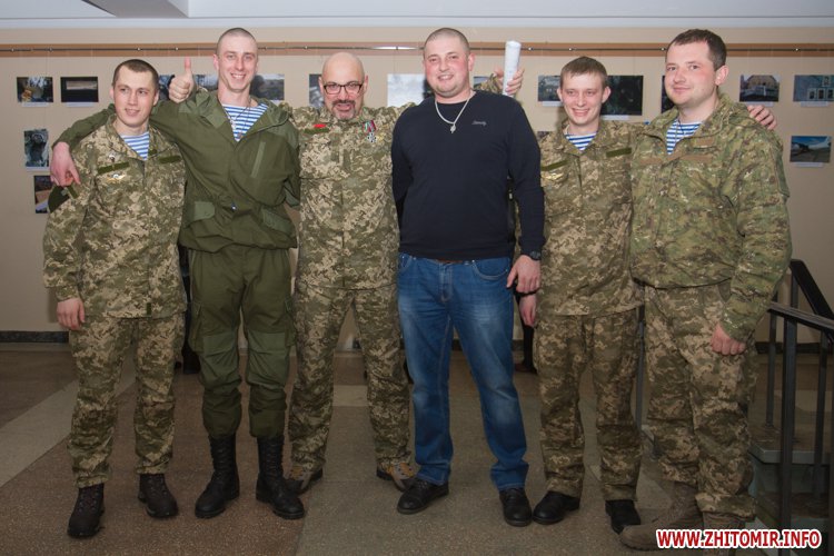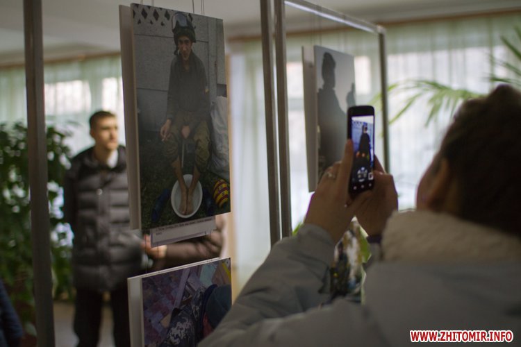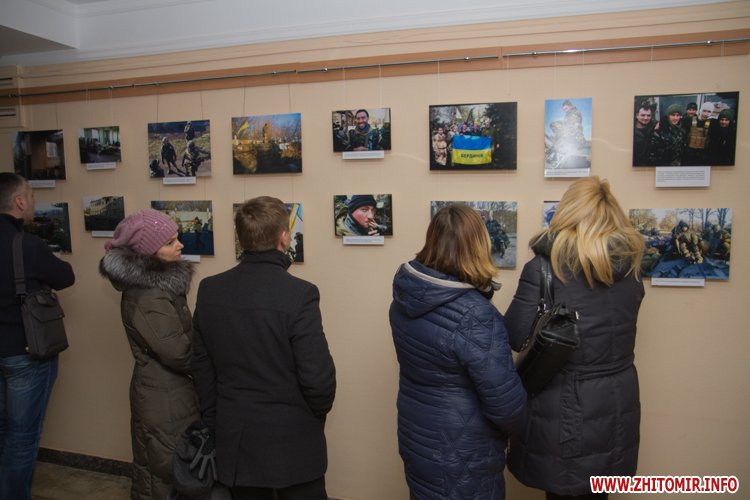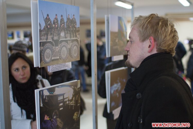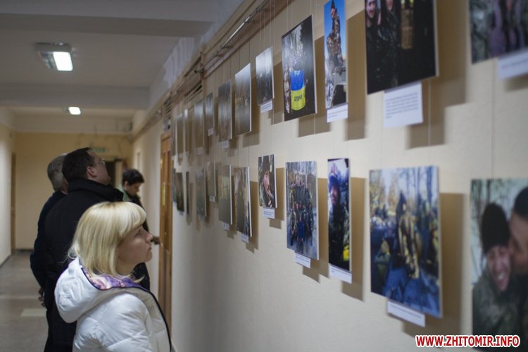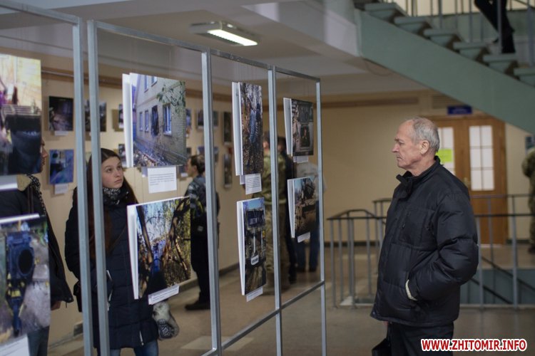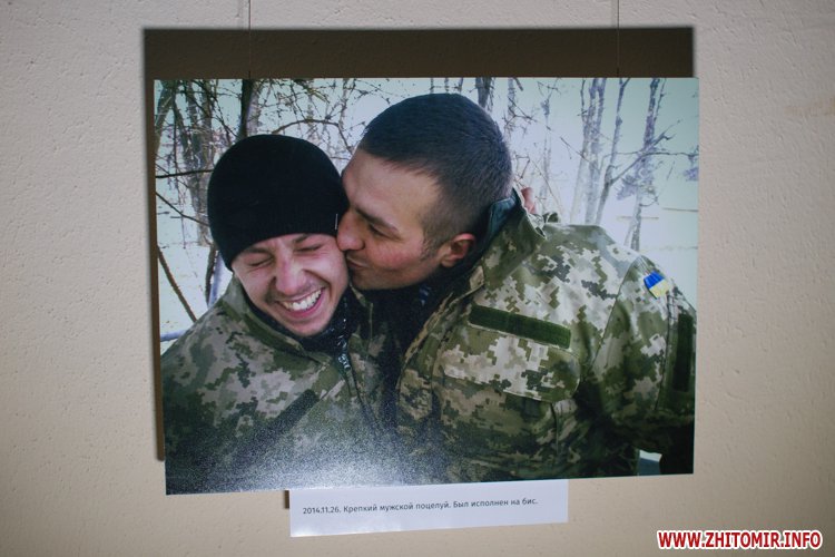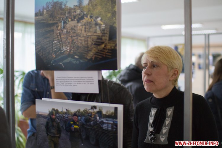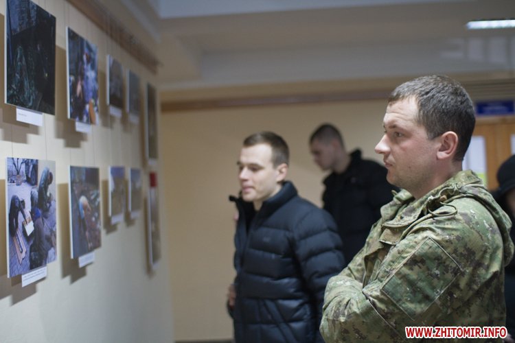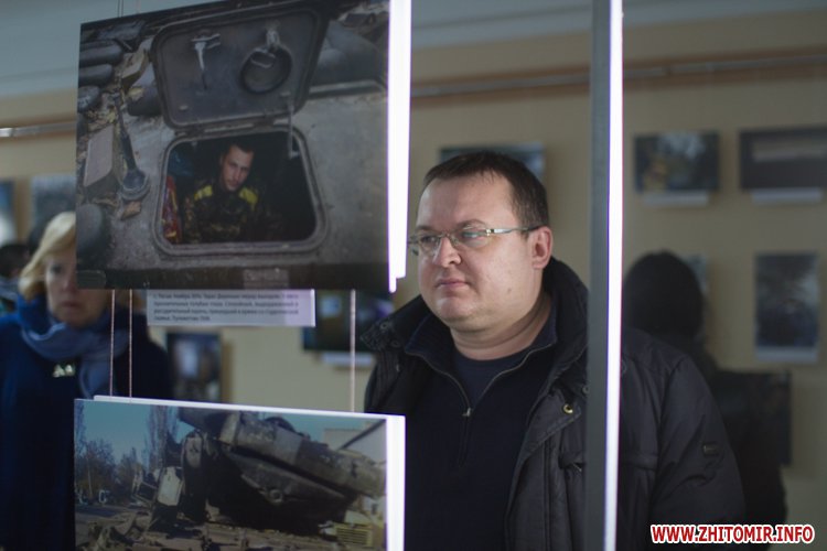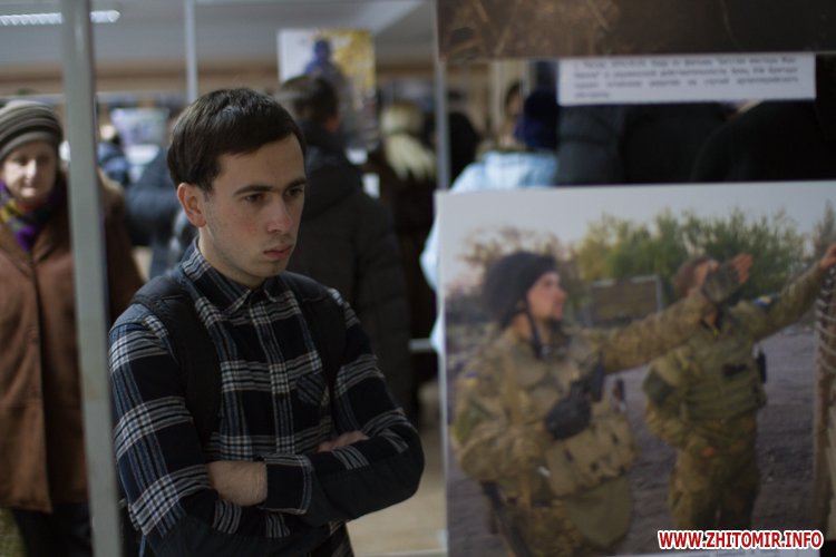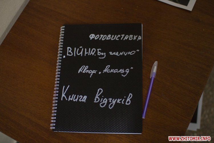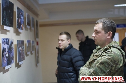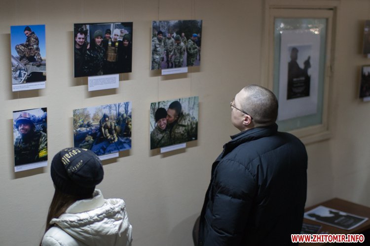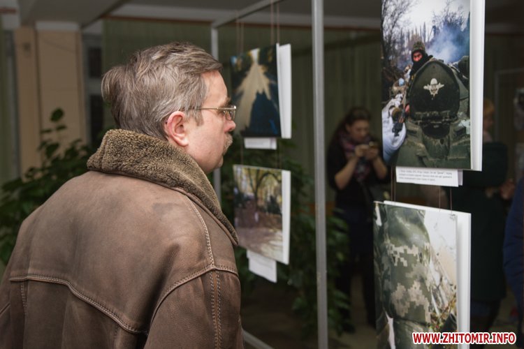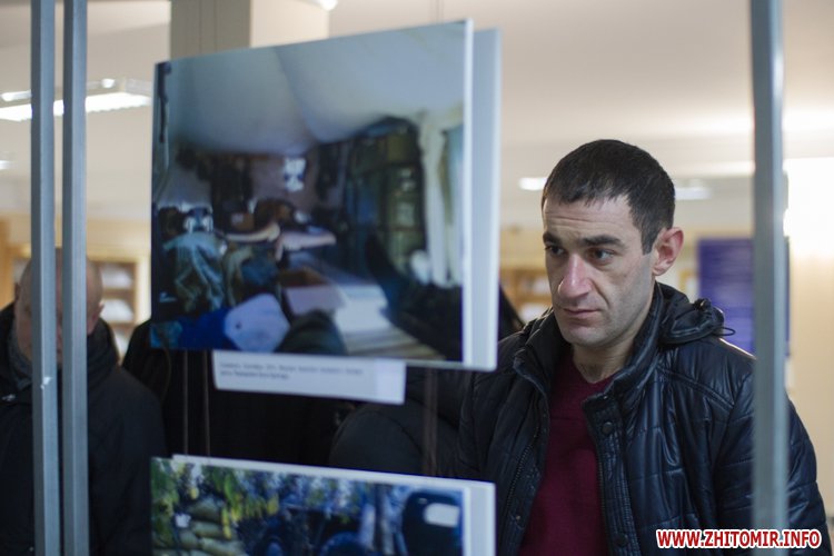 В областной библиотеке им.Ольжича на Новом бульваре представлены более сотни фотографий, которые «Аскольд» сделал во время пребывания в зоне АТО. На открытие выставки пришли сослуживцы фотографа – бойцы 4 роты 2 батальона 95 бригады и комроты с позывным «Медведь».