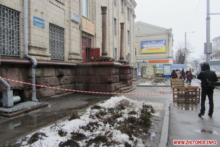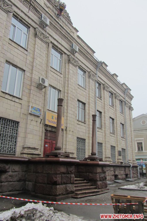 20 февраля в центре Житомира продолжаются работы по демонтажу герба СССР со здания обпотребсоюза.