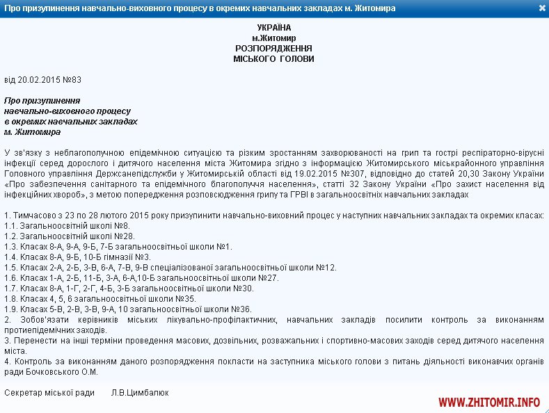 Так, розпорядженням міського голови від 20.02.2015 року тимчасово з 23 по 28 лютого 2015 року призупинено навчально-виховний процес у деяких навчальних закладах та окремих класах: загальноосвітній школі №8, загальноосвітній школі №28, класах 8-А, 9-А, 9-Б, 7-Б загальноосвітньої школи №1, класах 8-А, 9-Б, 10-Б гімназії №3, класах 2-А, 2-Б, 3-В, 6-А, 7-В, 9-В спеціалізованої загальноосвітньої школи №12, класах 1-А, 2-Б, 11-Б, 3-А, 6-А,10-Б загальноосвітньої школи №27, класах 8-А, 1-Г, 2-Г, 4-Б, 3-Б загальноосвітньої школи №30, класах 4, 5, 6 загальноосвітньої школи №35, класах 5-В, 2-В, 3-В, 9-А, 10 загальноосвітньої школи №36.