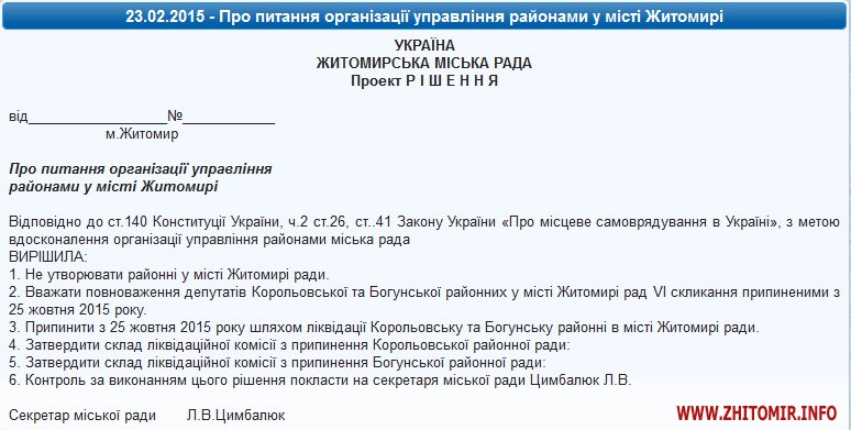 «Согласно ст.140 Конституции Украины, ч.2 ст.26, ст..41 Закона Украины «О местном самоуправлении в Украине», с целью совершенствования организации управления районами городской совет решил не создавать районные в городе Житомире совета. Считать полномочия депутатов Королевского и Богунского районных в городе Житомире советов VI созыва прекращенными с 25 октября 2015 года. Прекратить с 25 октября 2015 путем ликвидации Королевской и Богунский районные в городе Житомире совета», - говорится в проекте.