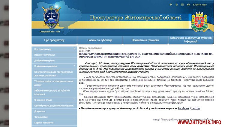 25 вересня 2014 року на сайті облдержадміністрації з’явилось повідомлення про те, що співробітники СБУ спільно з працівниками міліції викрили та припинили протиправну діяльність двох депутатів селищної ради Житомирського району, які вимагали та одержали 80 тисяч гривень неправомірної вигоди.