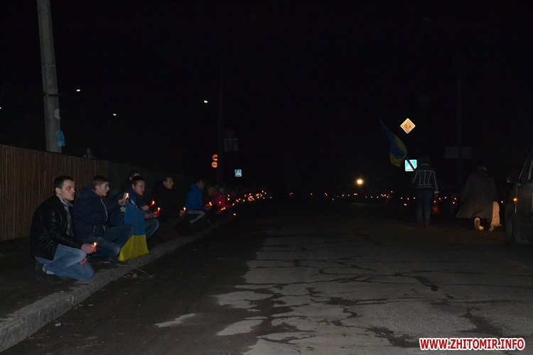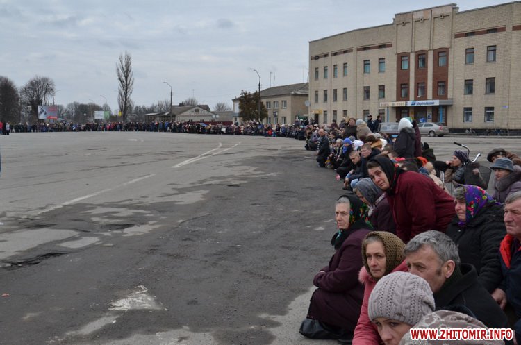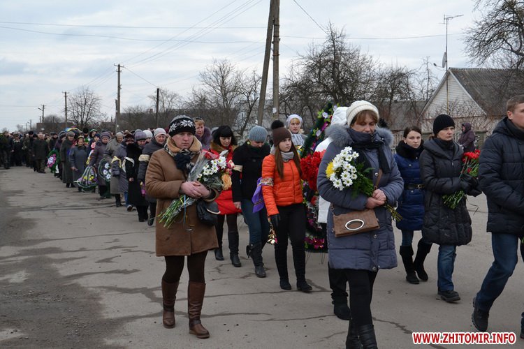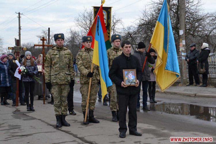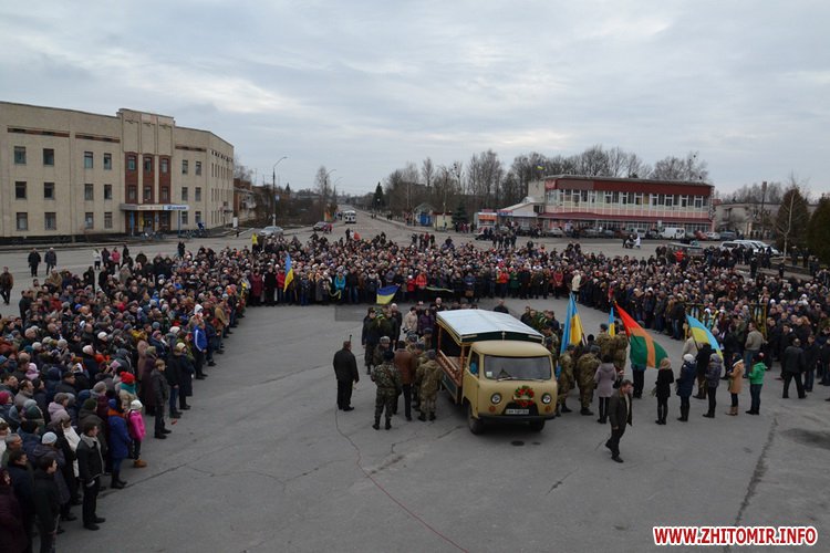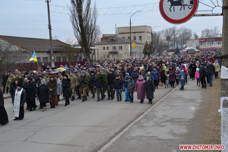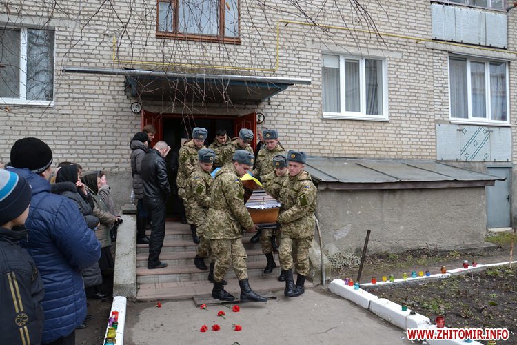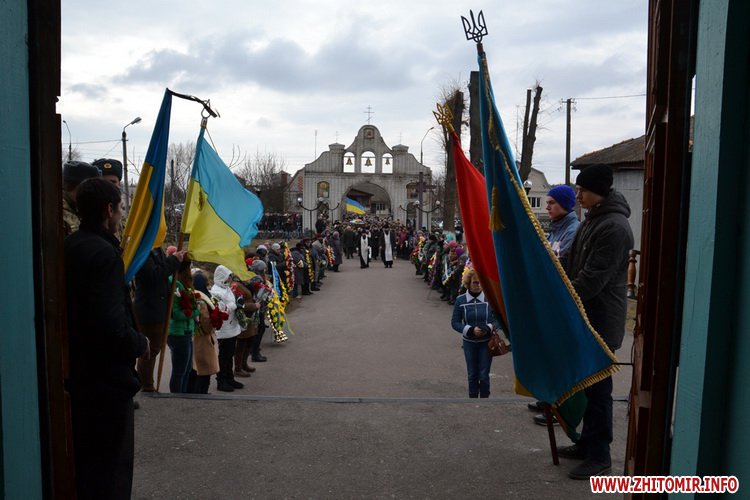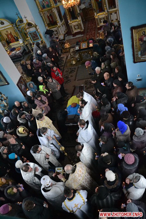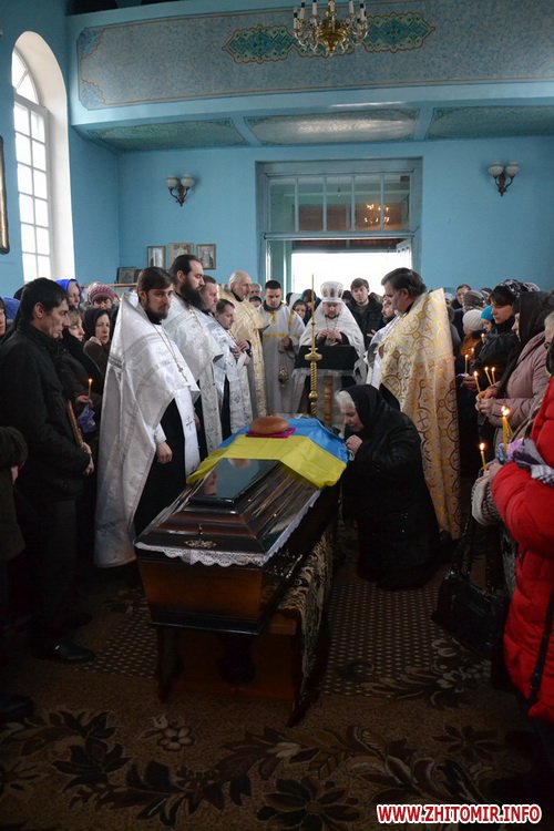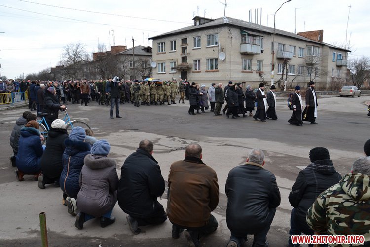 Нагадаємо, коли тіло загиблого на Донбасі бійця провозили через Житомир ввечері 28 лютого, до Свято-Михайлівського кафедрального собору прийшли близько сотні людей: настоятель собору отець Богда Бойко прочитав молитву, а всі присутні стали навколішки і схилили голови.